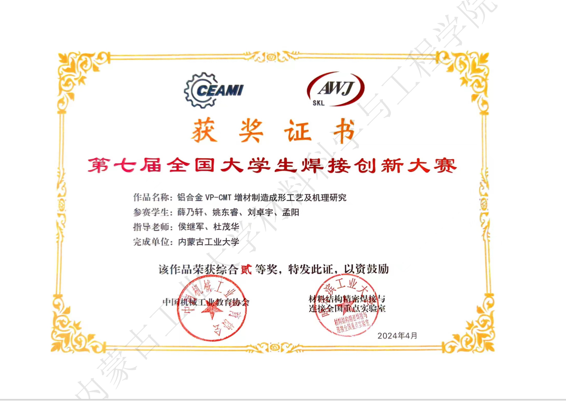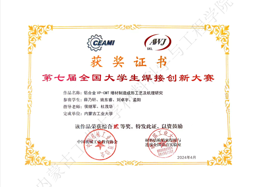 全国大学生焊接创新大赛由教育部高等学校材料类专业教学指导委员会、中国机械工业教育协会、中国机械工程学会焊接学会和哈尔滨工业大学先进焊接与连接国家重点实验室共同主办,是面对全国焊接技术与工程、材料成型及控制工程及其相关专业举办的全国性科技创新大赛,旨在加强大学生实践能力和创新意识的培养。比赛作品具体内容包括:焊接新方法、新工艺、新材料;焊接应力变形控制新技术;焊接研究与生产的测试分析方法;新型焊接电源及辅机的设计;新型焊接工装夹具等。重点考察作品创新思想和学生实际动手能力。比赛每年举办1次。我校与国内众多知名高校,如哈尔滨工业大学、天津大学、山东大学和西北工业大学等60所高校的195支参赛队伍, 400余名专家、师生参加大赛。经过作品现场测试、选手线上答辩、专家提问评审等环节,最终获得一等奖1项、二等奖1项。其中,由材料成型及控制工程(焊接方向)学生高明新、郭丰硕、郭华、祁晓辉的固定命题参赛作品《基于选区激光熔化增材制造的高硬度复合板材设计》获得一等奖,作品指导教师为孙振邦老师,曹四龙老师。薛乃轩、姚东睿、刘卓宇、孟阳的自由命题参赛作品《铝合金VP-CMT增材制造成形工艺及机理研究》获得二等奖,作品指导教师为侯继军老师,杜茂华老师。