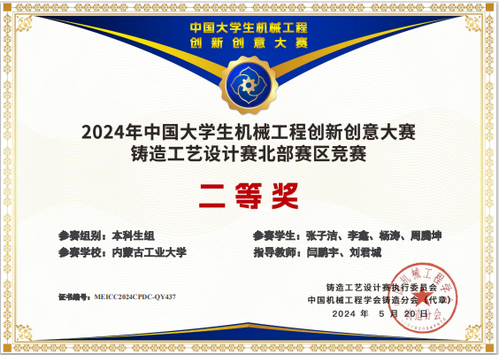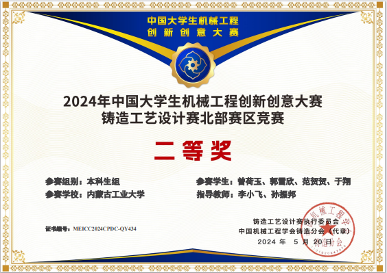 5月30日,2024年中国大学生机械工程创新创意大赛——铸造工艺设计赛全国总决赛举行。本届大赛有来自东北大学、华中科技大学、大连理工大学、沈阳工业大学等132所高校5951名学子参加,参赛作品1715份,其中本科生组1485份,研究生组230份。我院材料成型及控制工程专业四组本科生(共16名学生)荣获北方区赛二等奖,一组研究生(共2名)荣获全国大赛三等奖。