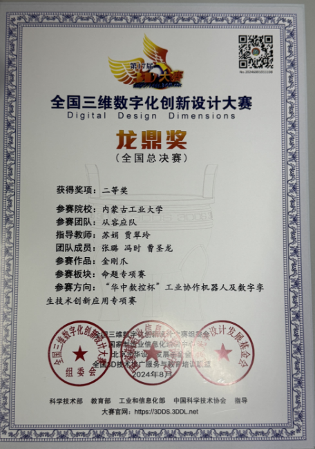 8月18-21日,由全国三维数字化创新设计大赛组委会、国家制造业信息化培训中心、全国3D技术推广服务与教育培训联盟(3D动力)主办,中国航天航空大学大学承办的2024年第17届全国三维数字化创新设计大赛“华中数控杯”工业协作机器人及数字孪生技术创新应用专项赛总决赛顺利举行。来自全国16个赛区70多所院校146个团队参赛。由yL23411永利官网登录苏娟副教授和工程训练中心贾翠玲正高级实验师指导的、由张璐、冯时、曹胜龙组成的“从容应对”团队凭借作品《金刚爪》荣获国赛二等奖。